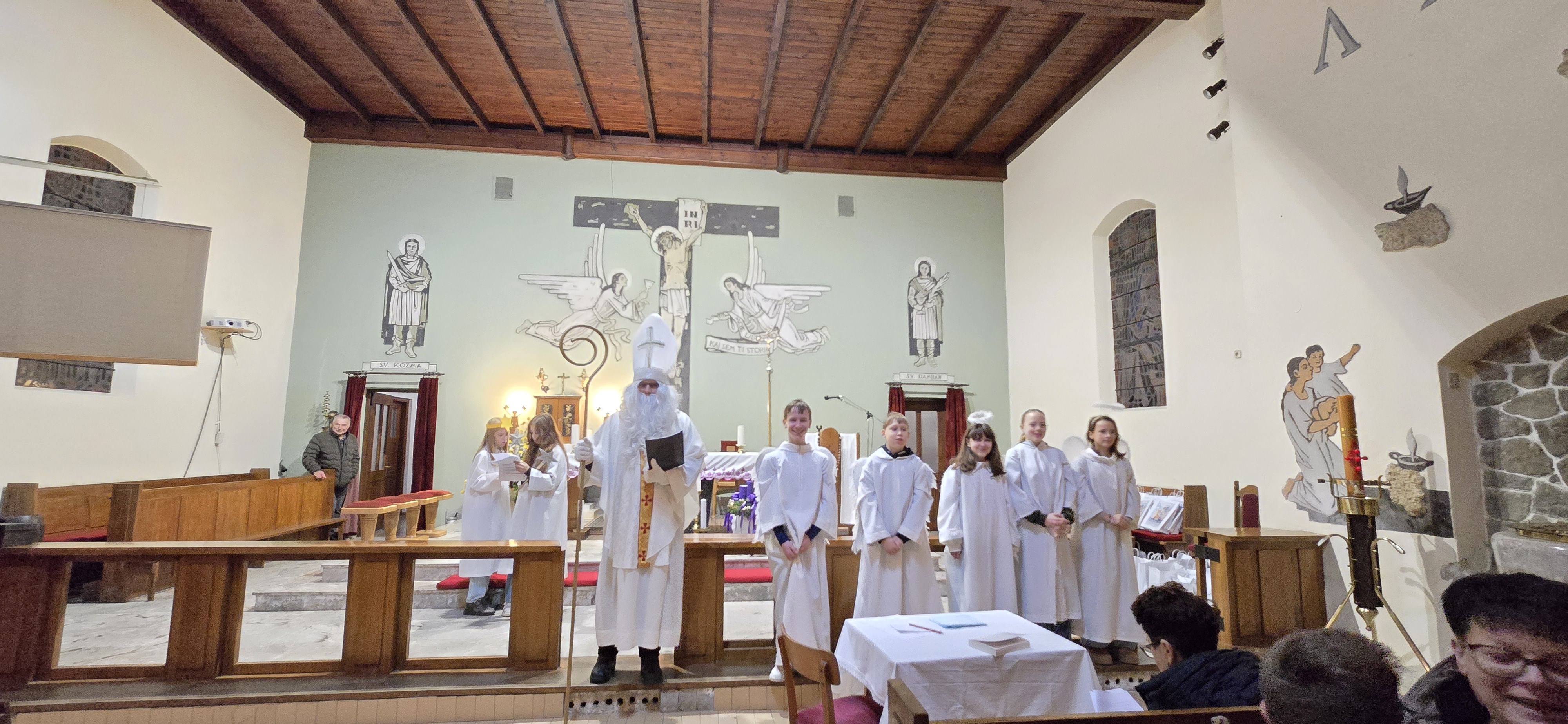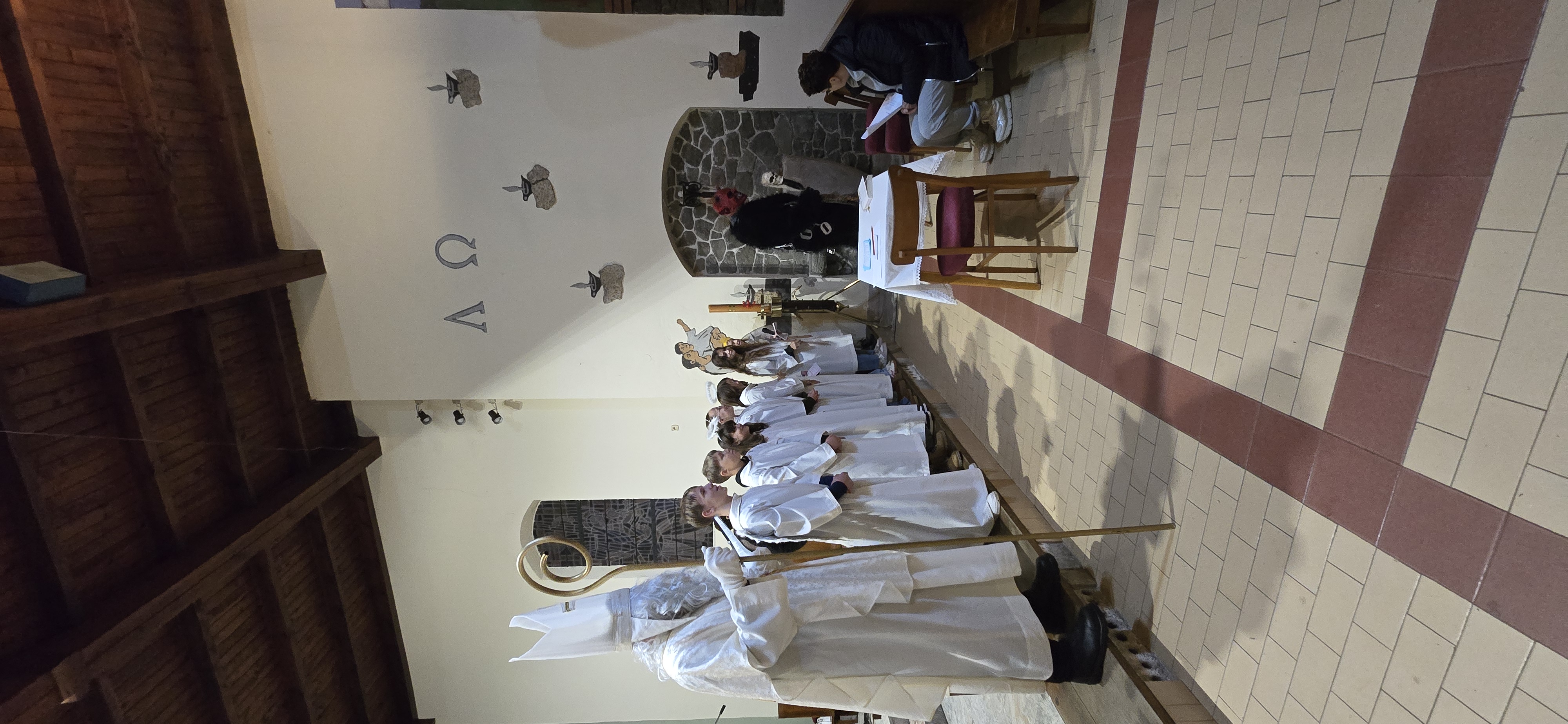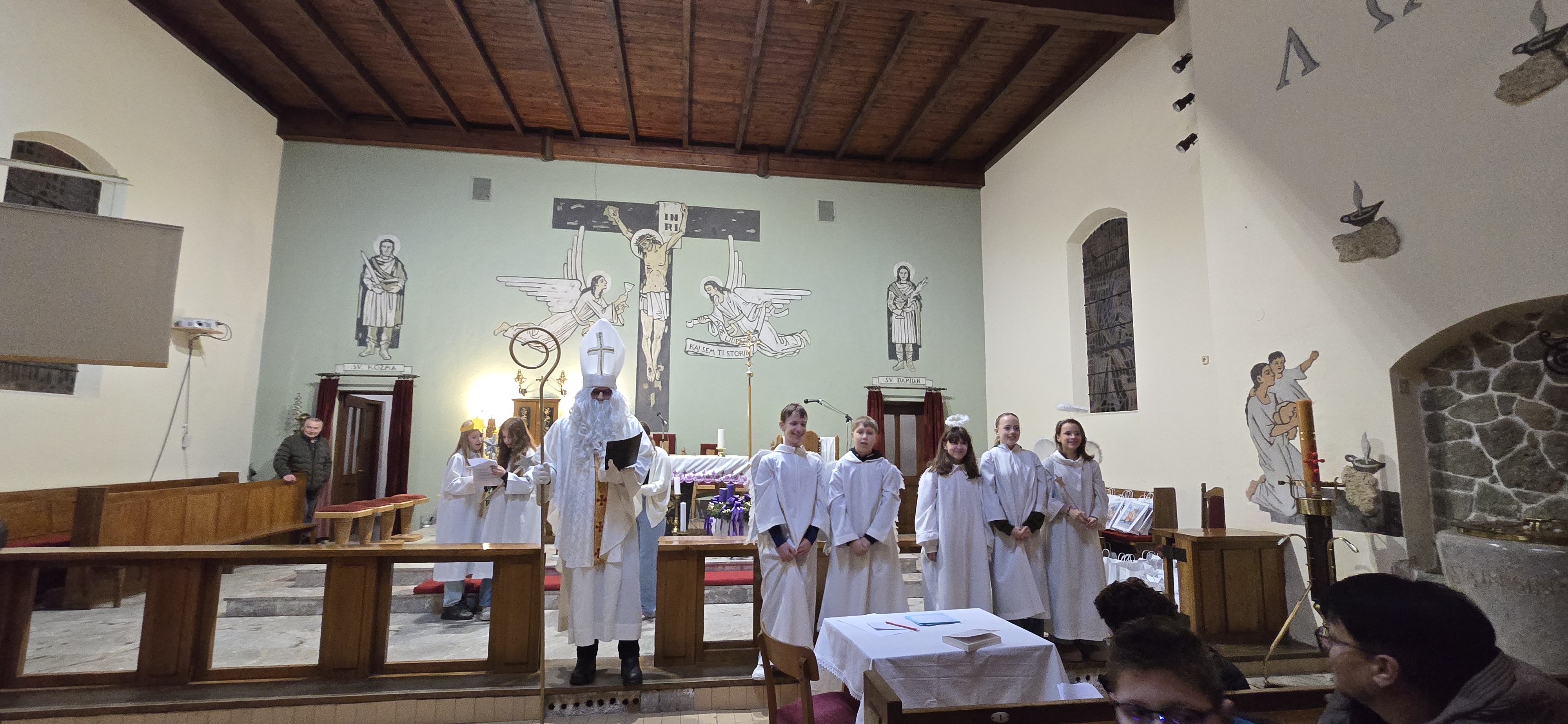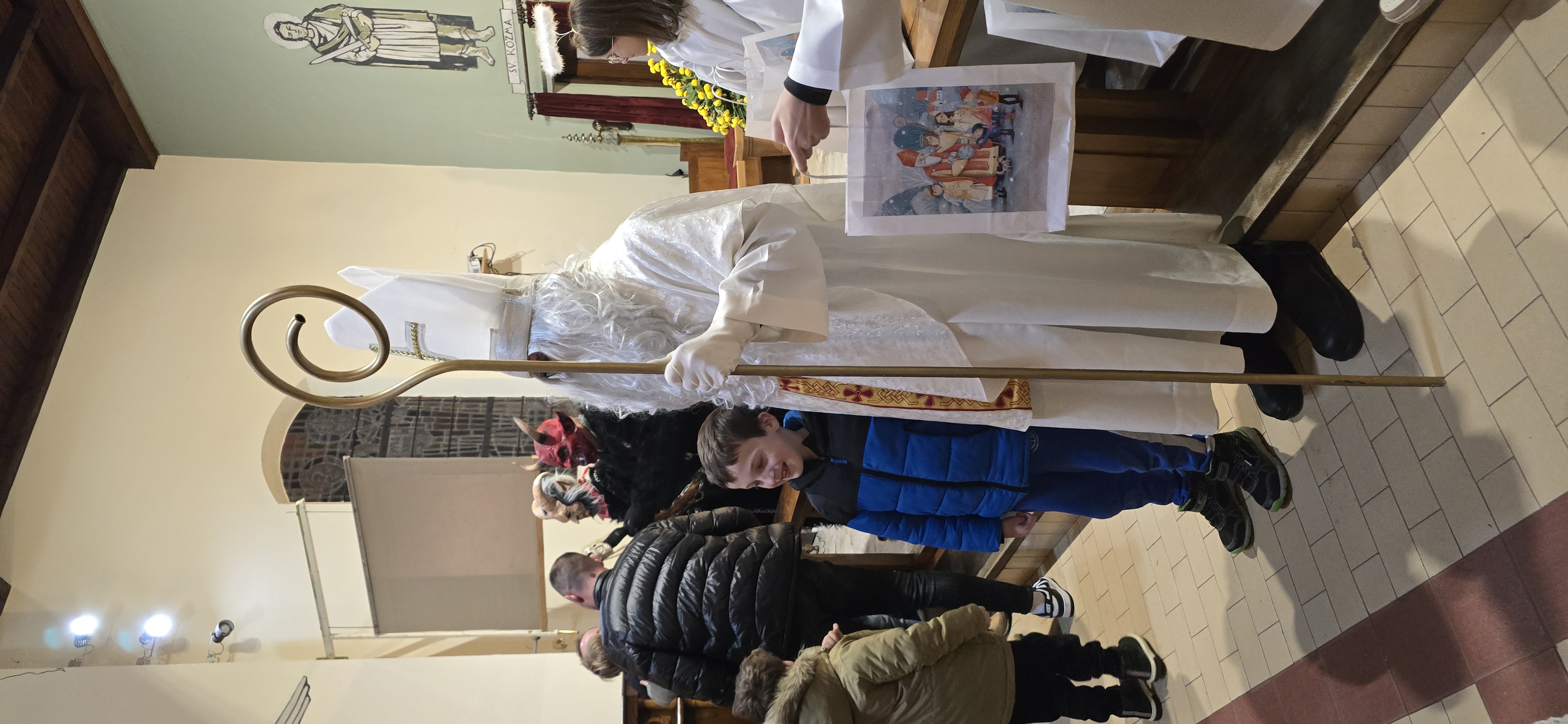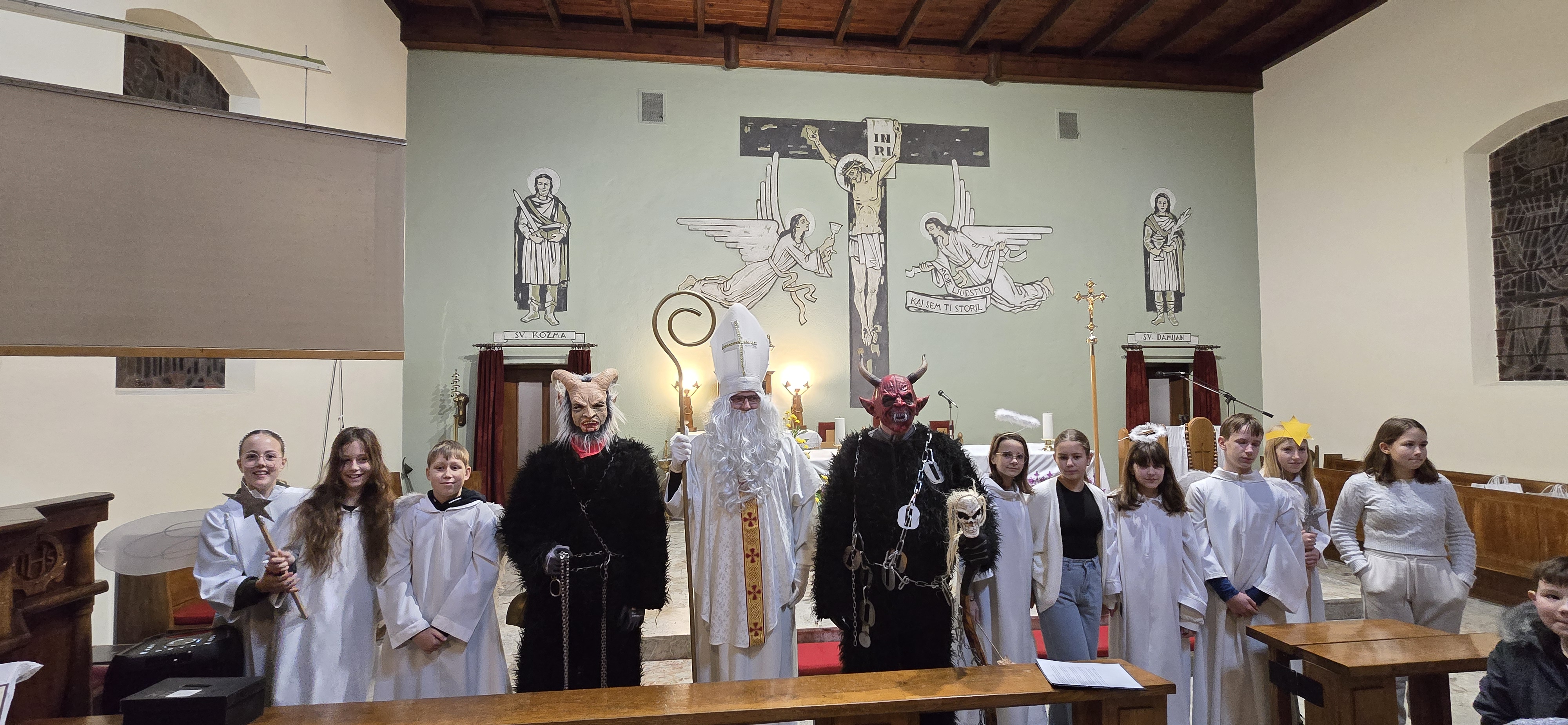 Današnje čakanje na svetega Miklavža je bilo malce mučno, minute so se vlekle...Medtem ko so veroučenci uprizorili igrico, so naši najmlajši vedno znova pogledovali nazaj proti vratom cerkve. A ko se ja pojavila brada svetega Miklavža, je vsem zadišalo po sladkih pričakovanjih in povečalo se veselje v cerkvi. Za piko na i je ob koncu večera v župnišču zadišalo po pici, kar je veroučence še posebej navdušilo.