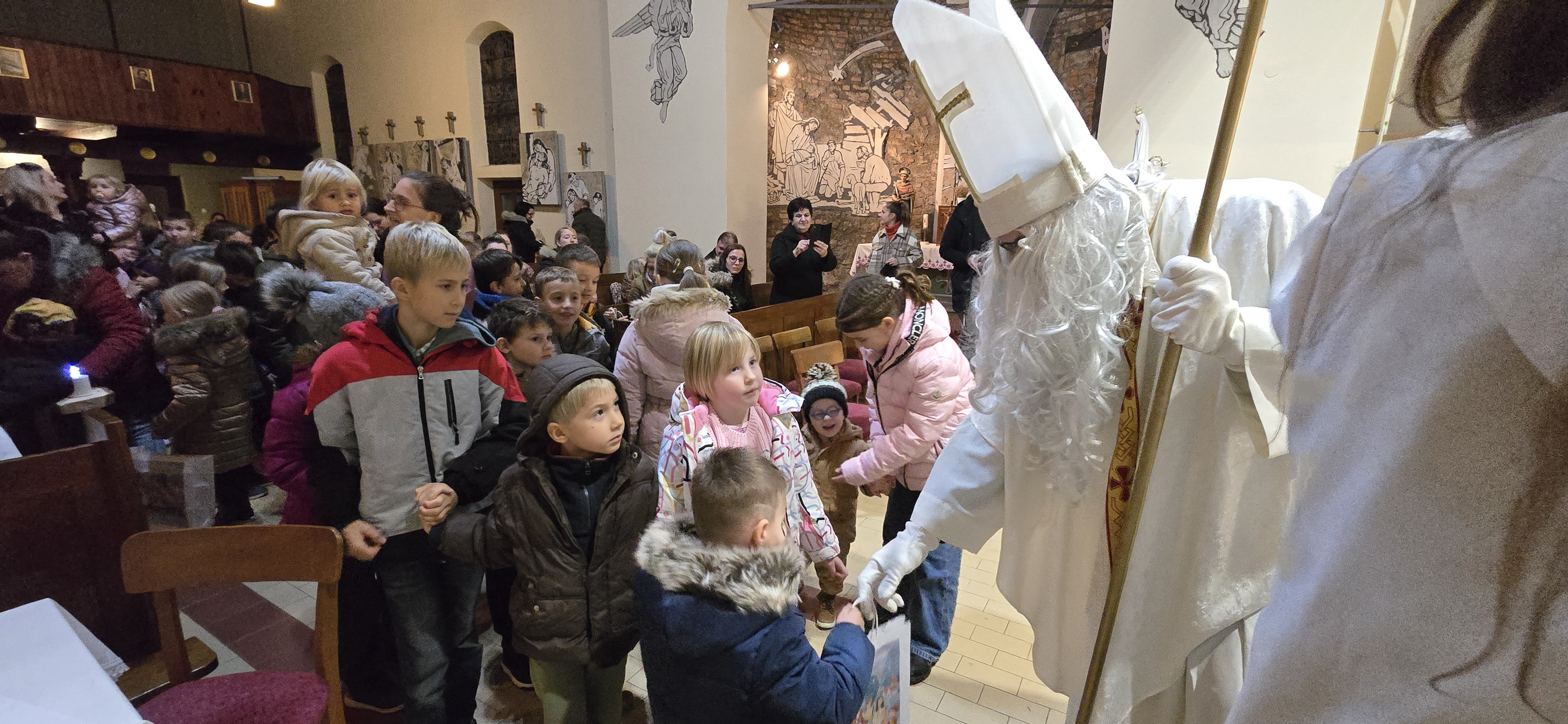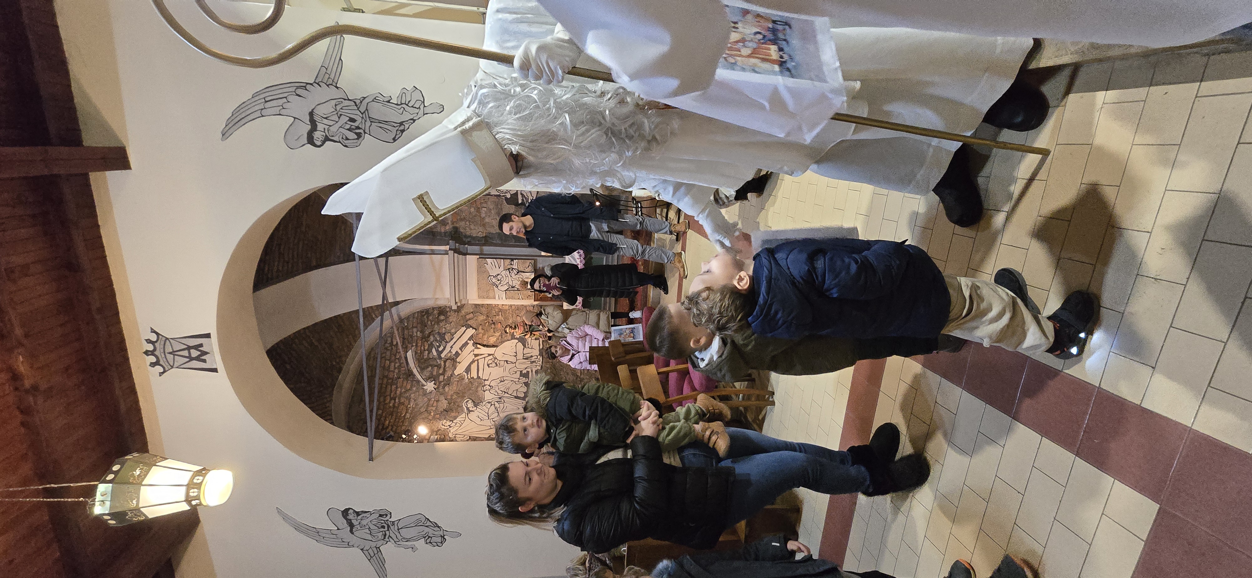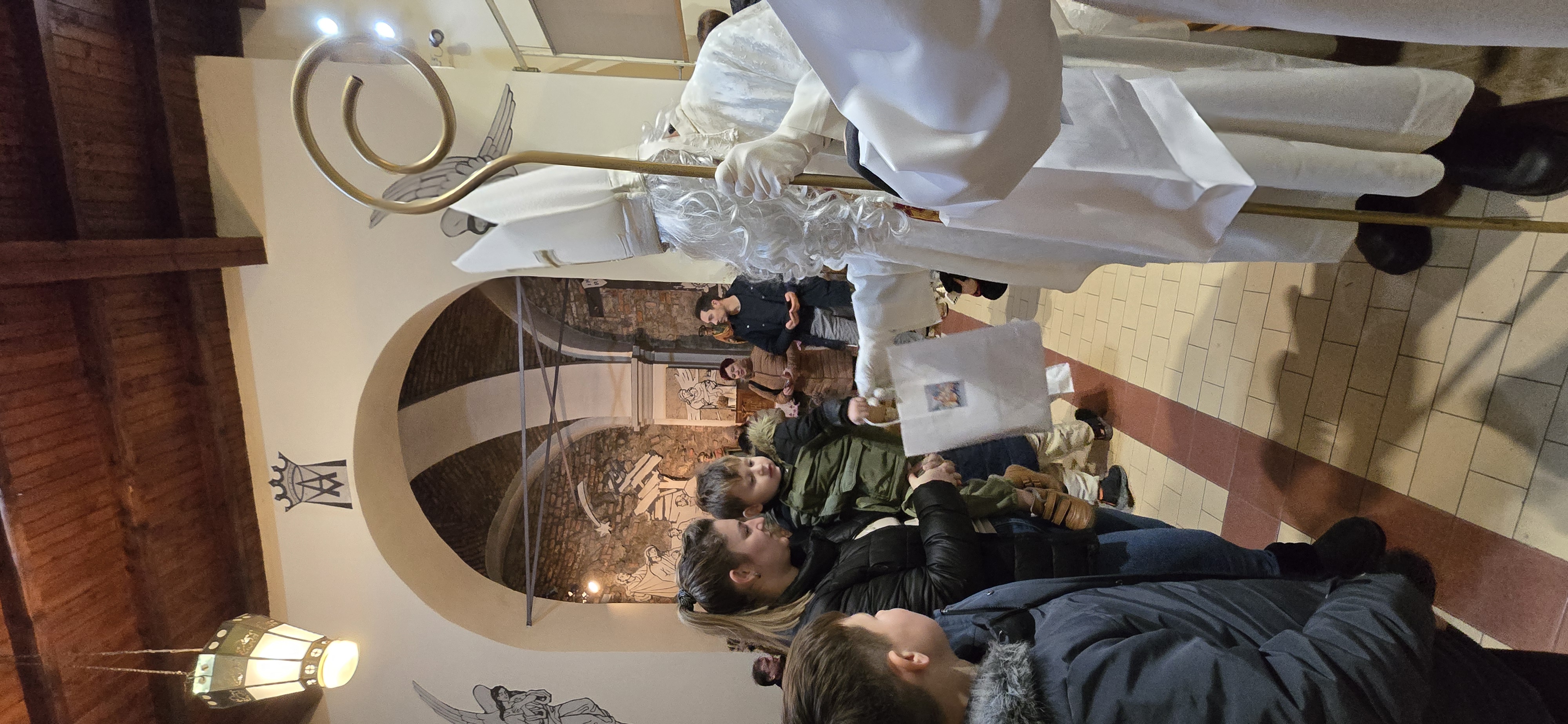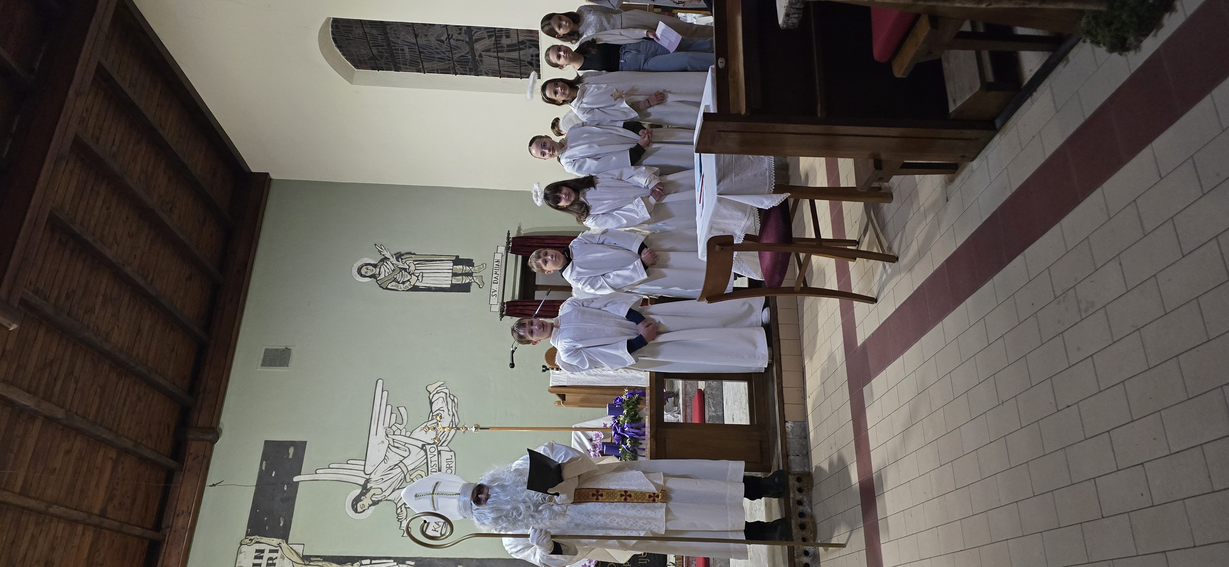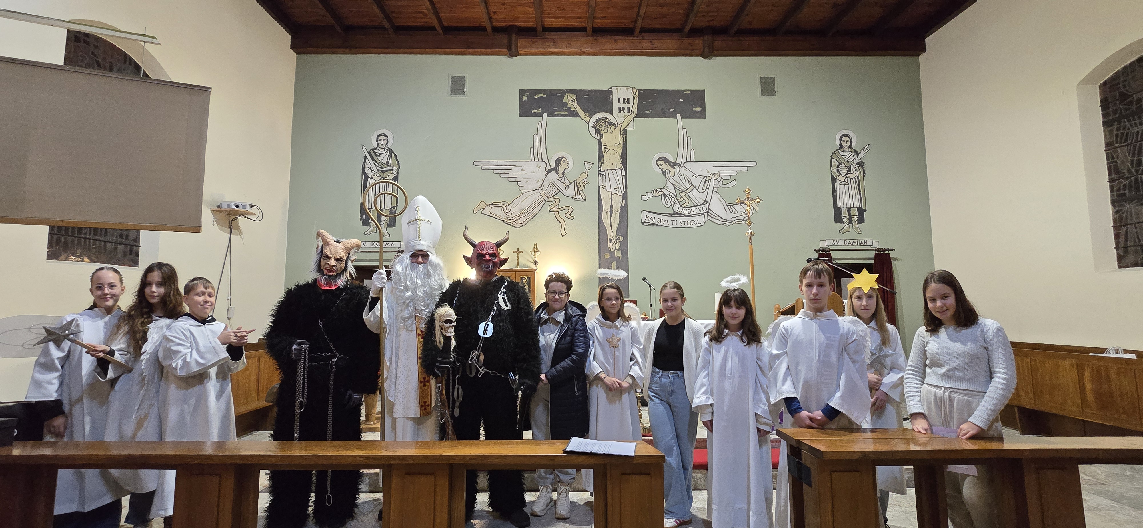 Današnje čakanje na svetega Miklavža je bilo malce mučno, minute so se vlekle...Medtem ko so veroučenci uprizorili igrico, so naši najmlajši vedno znova pogledovali nazaj proti vratom cerkve. A ko se ja pojavila brada svetega Miklavža, je vsem zadišalo po sladkih pričakovanjih in povečalo se veselje v cerkvi. Za piko na i je ob koncu večera v župnišču zadišalo po pici, kar je veroučence še posebej navdušilo.