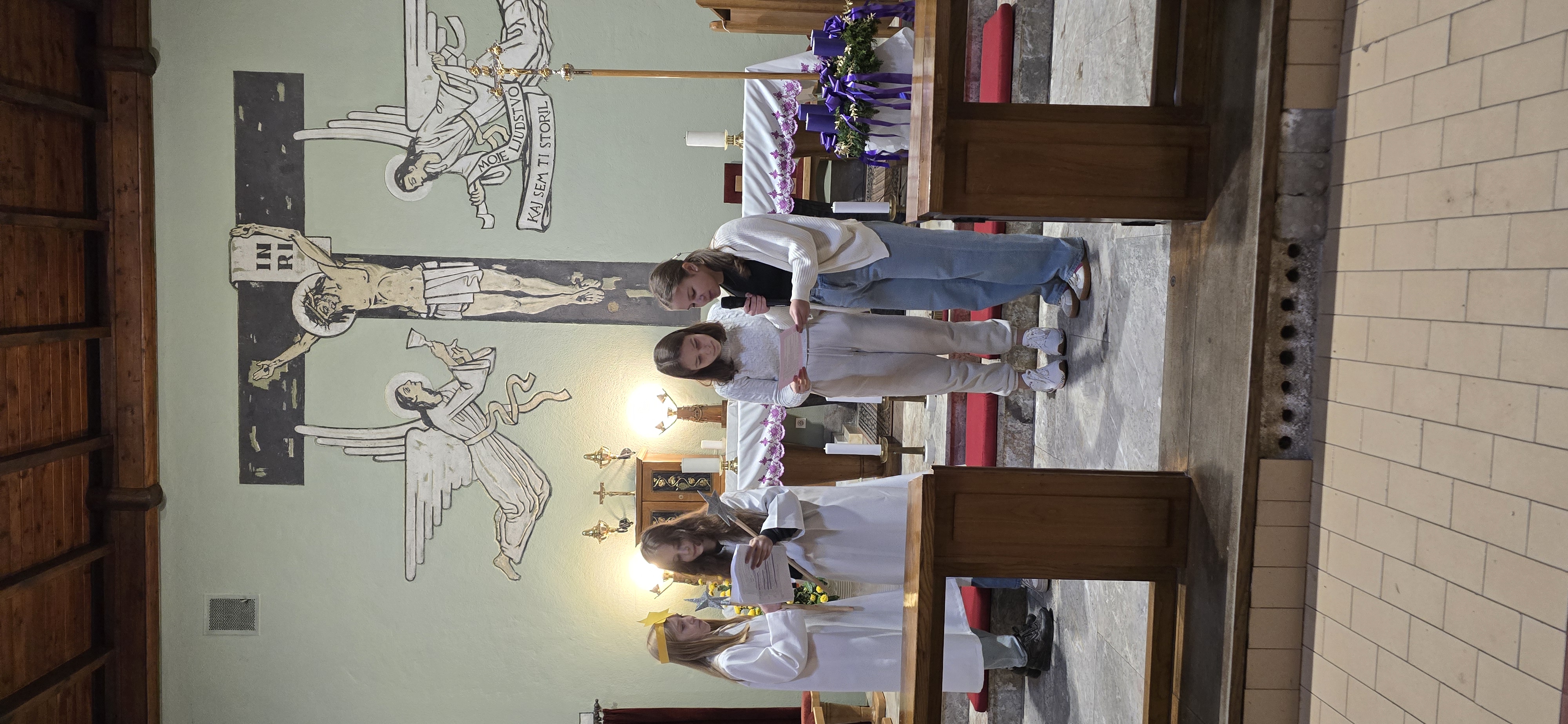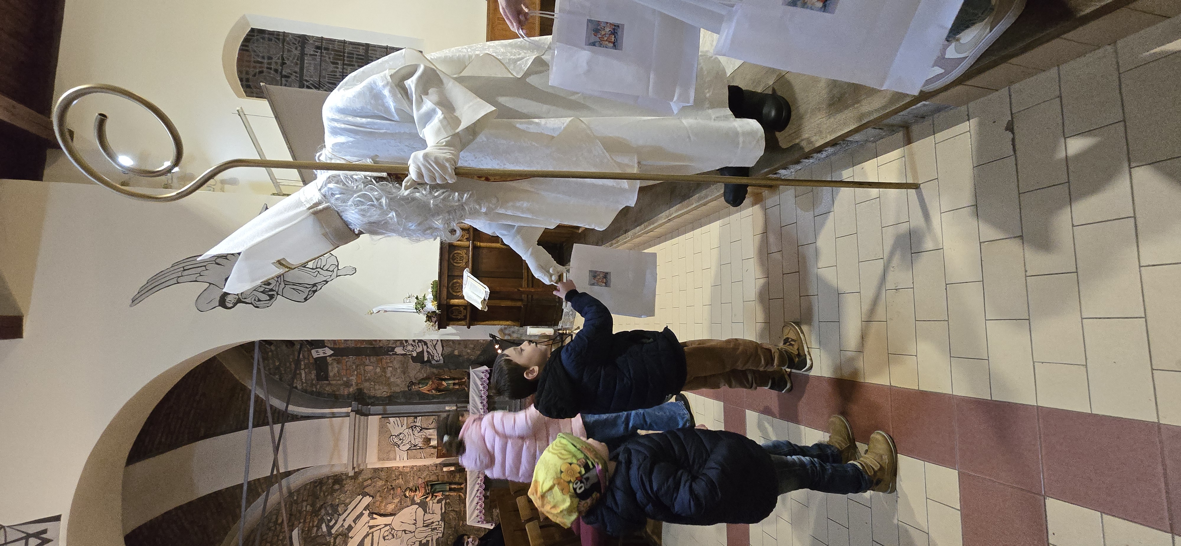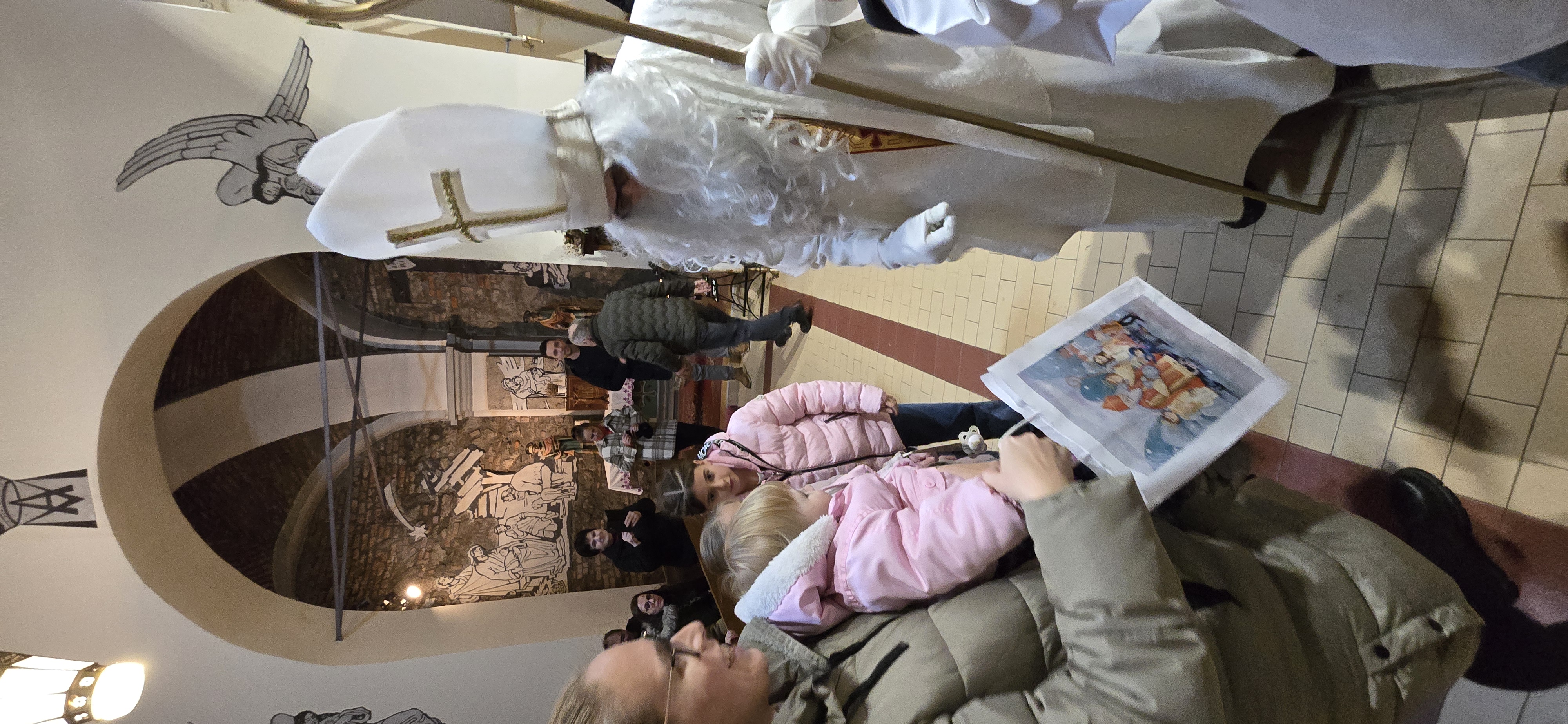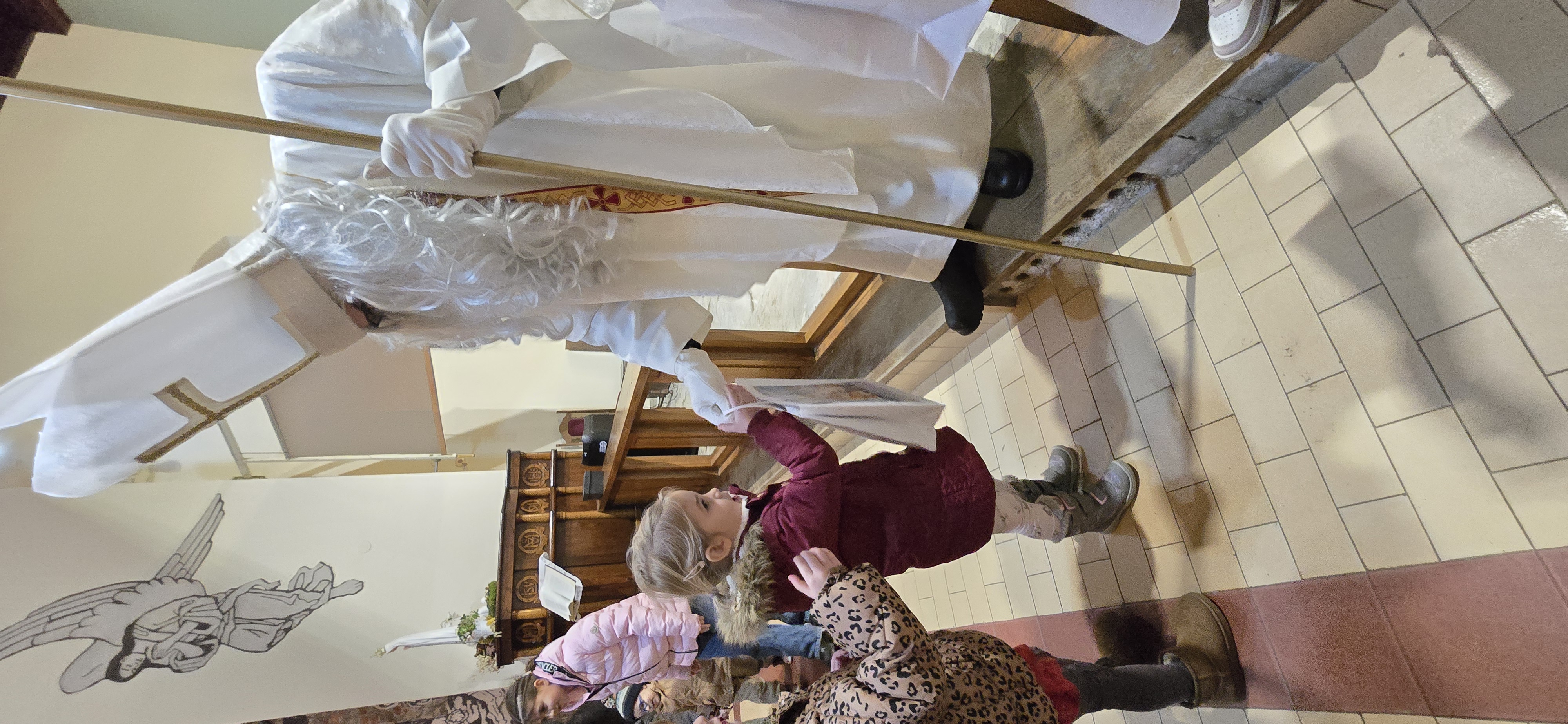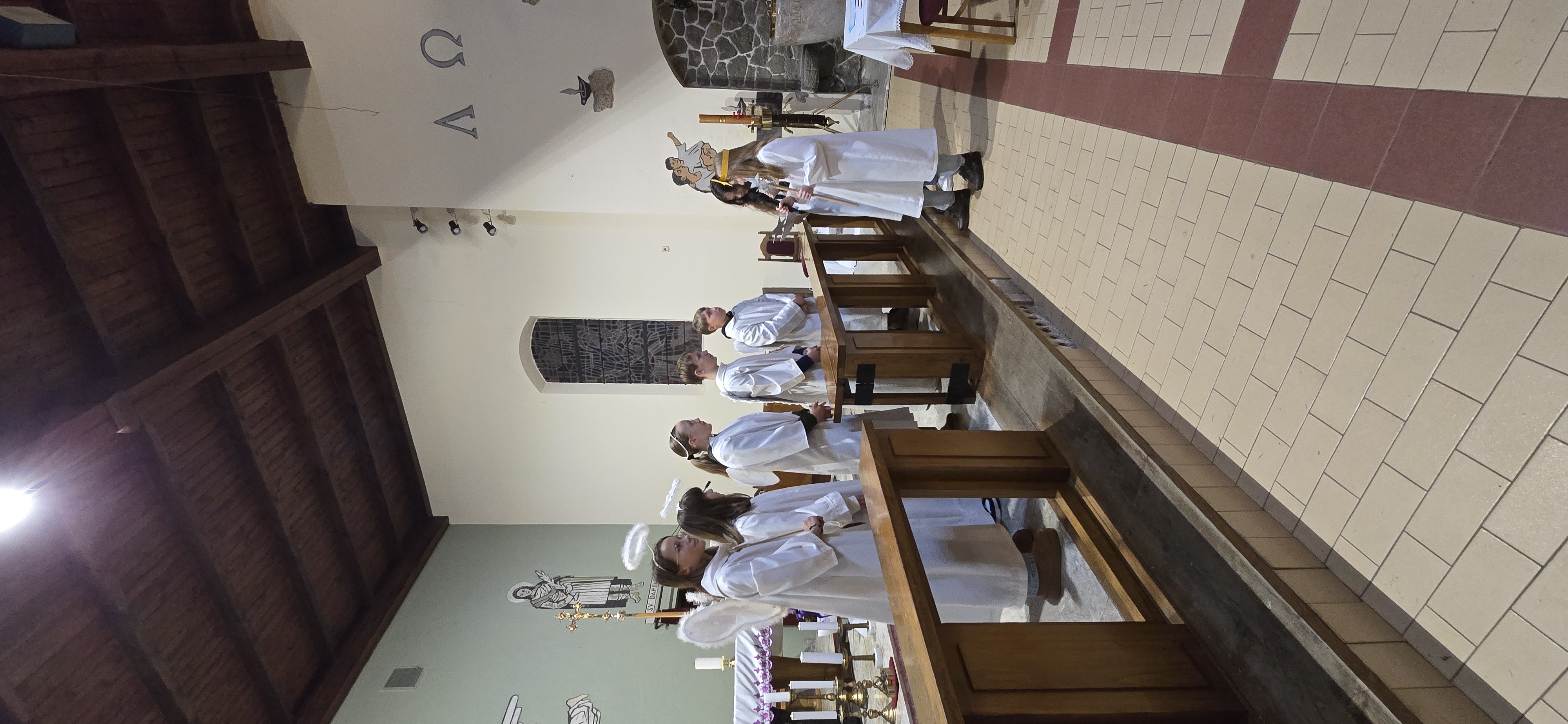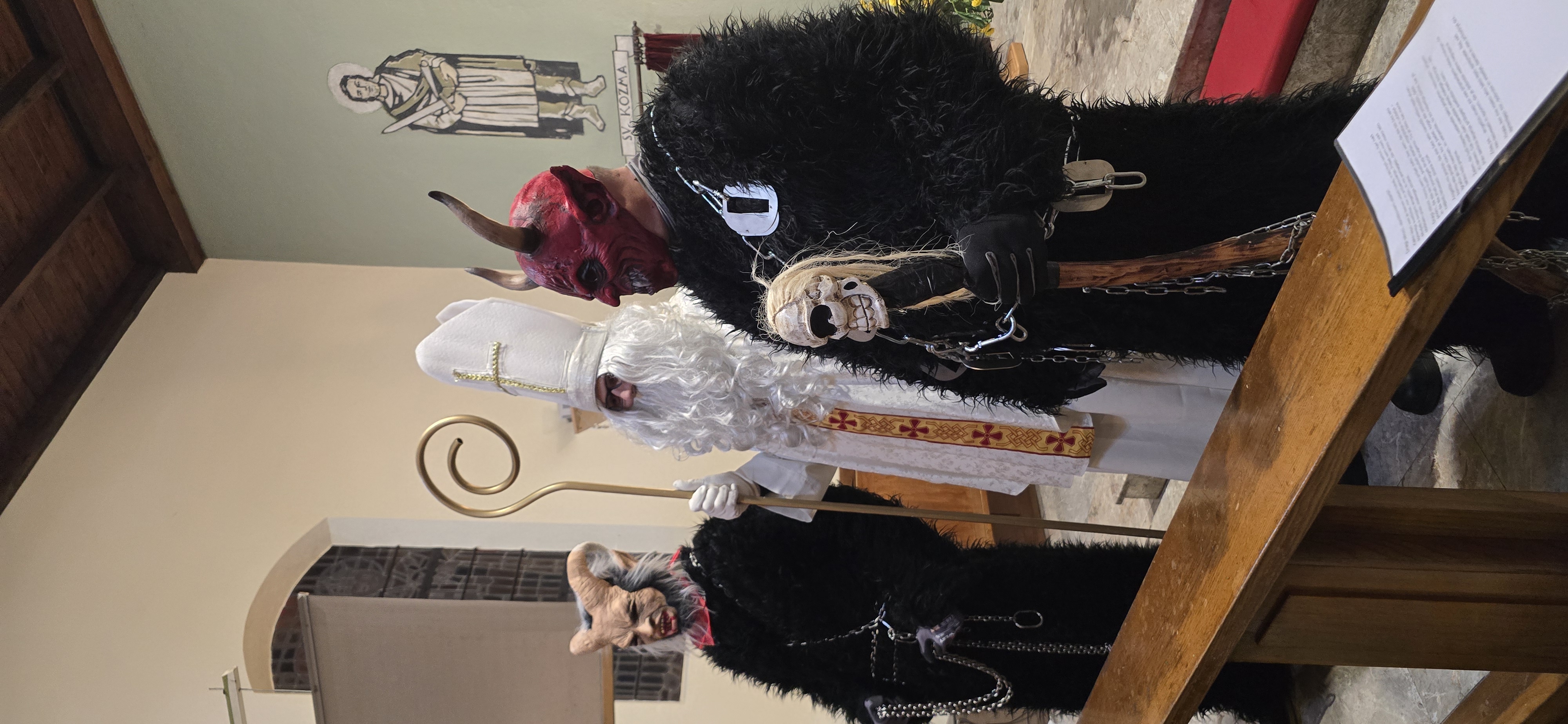 Današnje čakanje na svetega Miklavža je bilo malce mučno, minute so se vlekle...Medtem ko so veroučenci uprizorili igrico, so naši najmlajši vedno znova pogledovali nazaj proti vratom cerkve. A ko se ja pojavila brada svetega Miklavža, je vsem zadišalo po sladkih pričakovanjih in povečalo se veselje v cerkvi. Za piko na i je ob koncu večera v župnišču zadišalo po pici, kar je veroučence še posebej navdušilo.