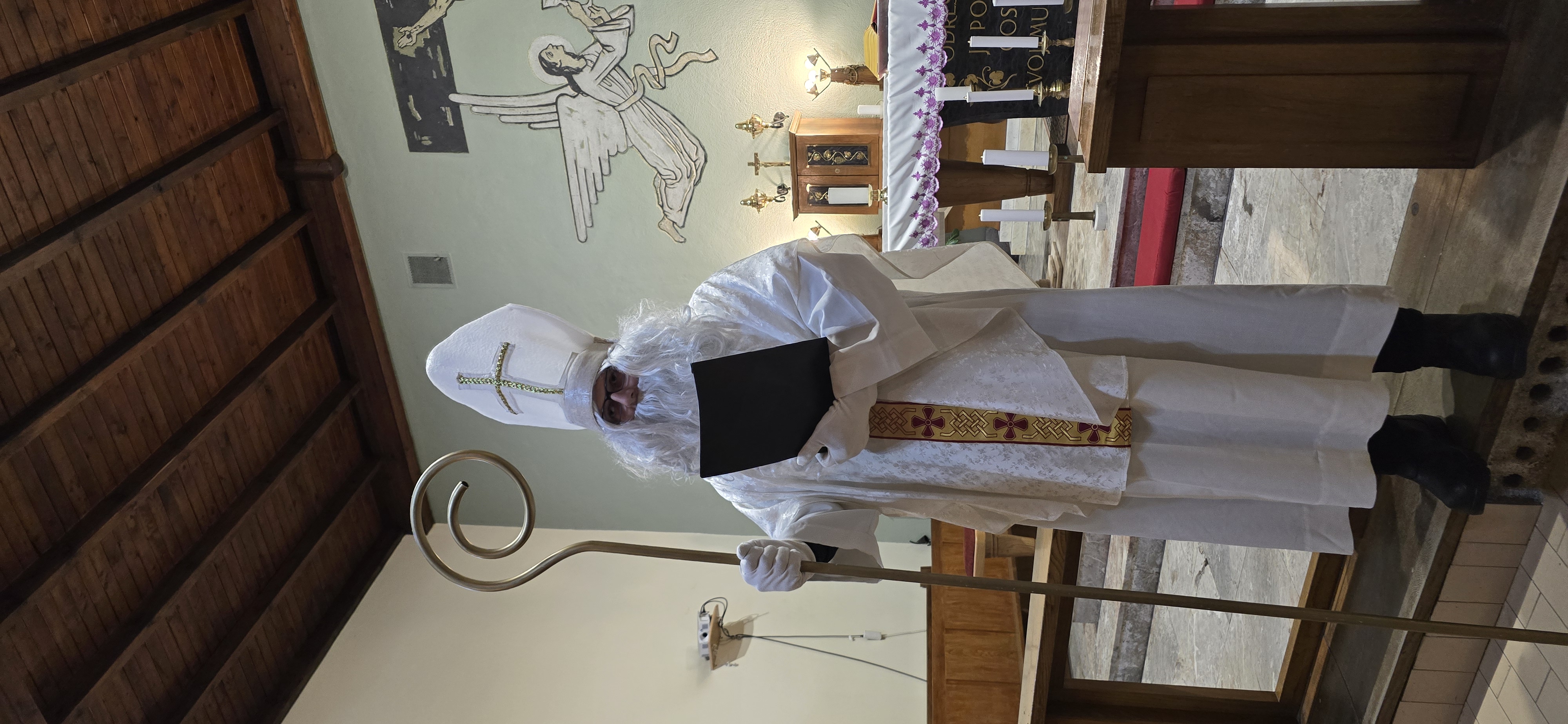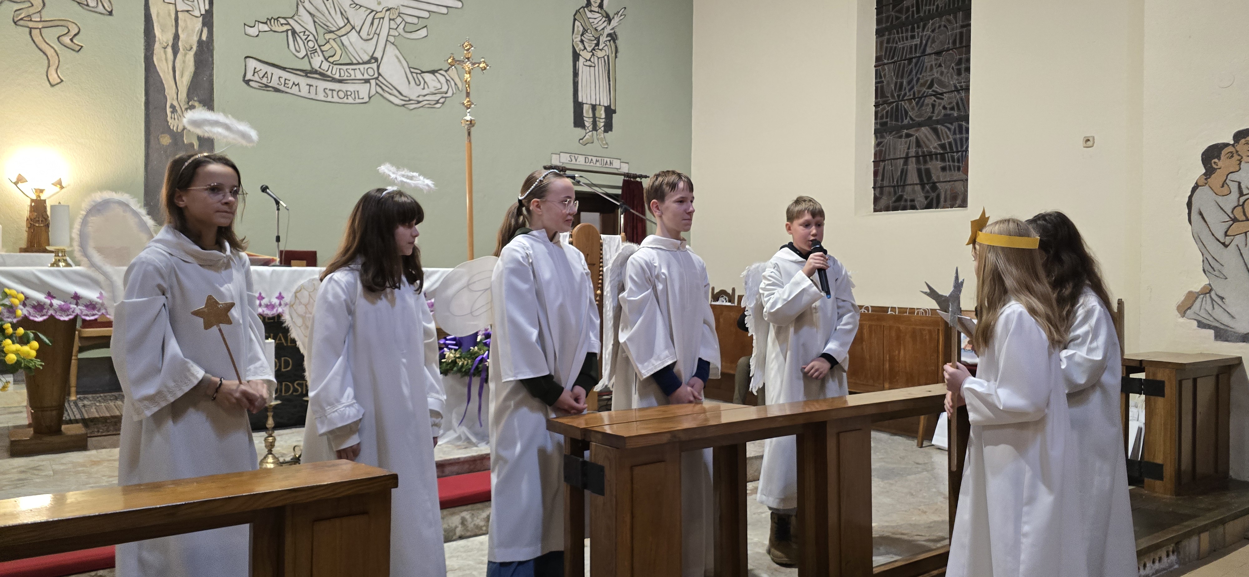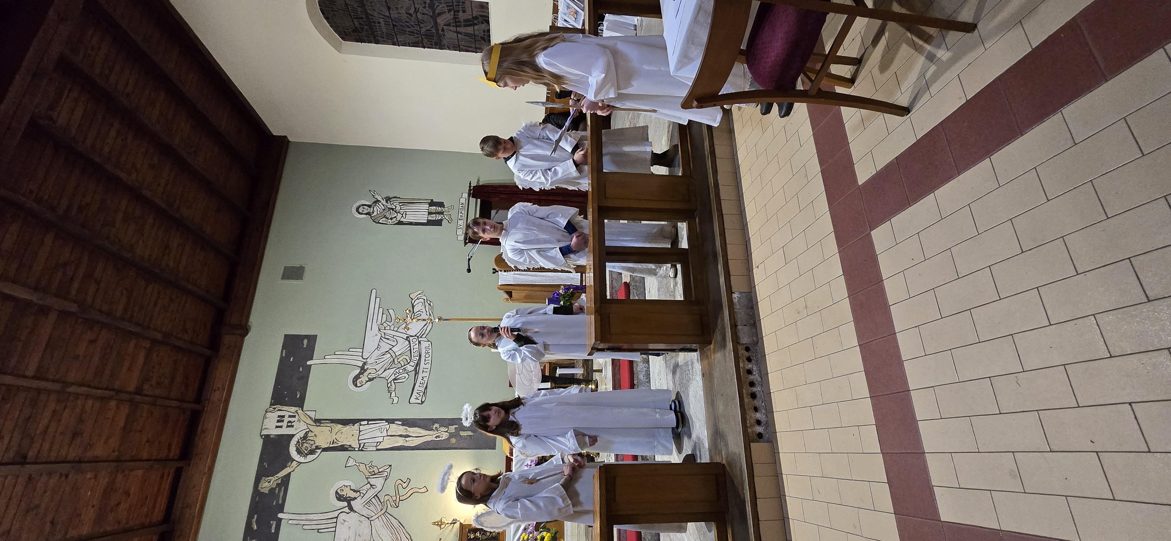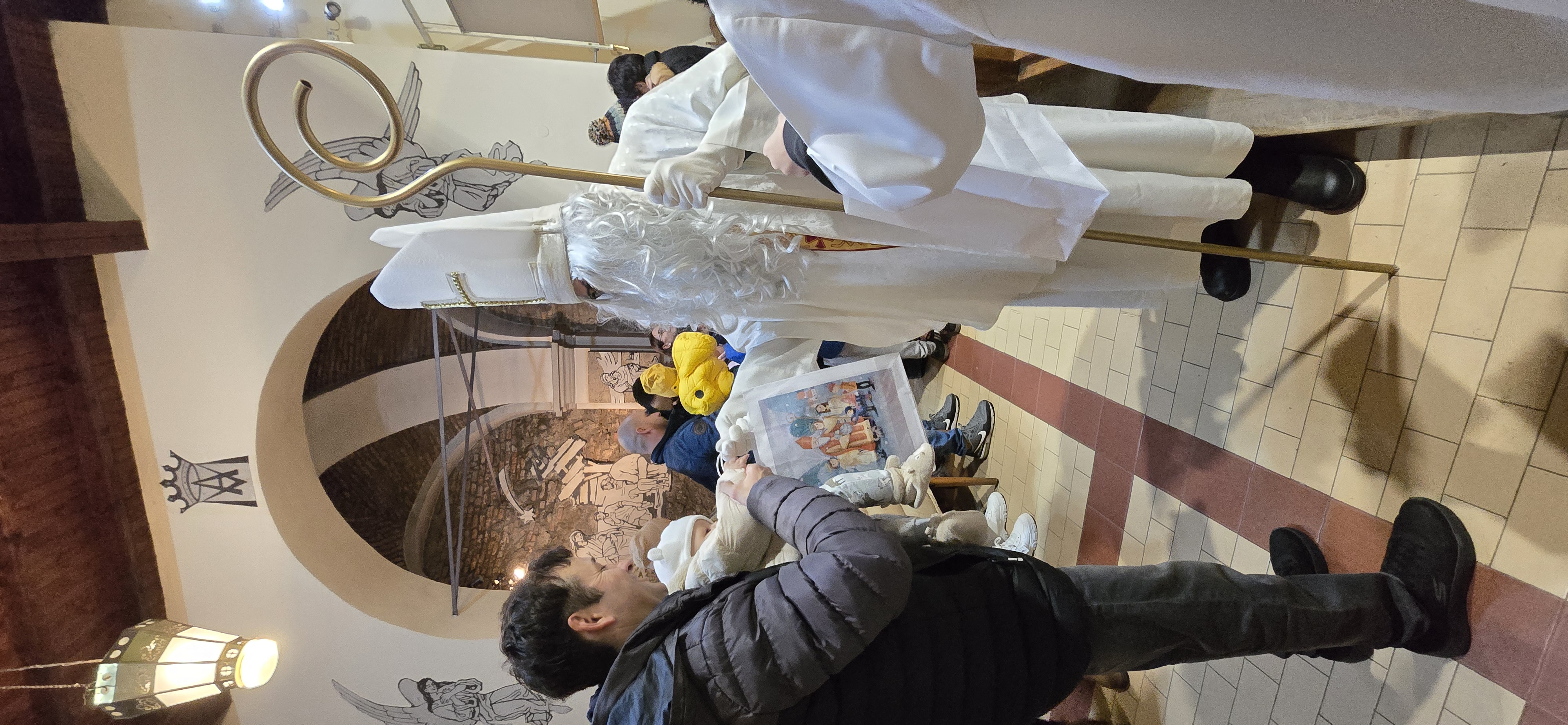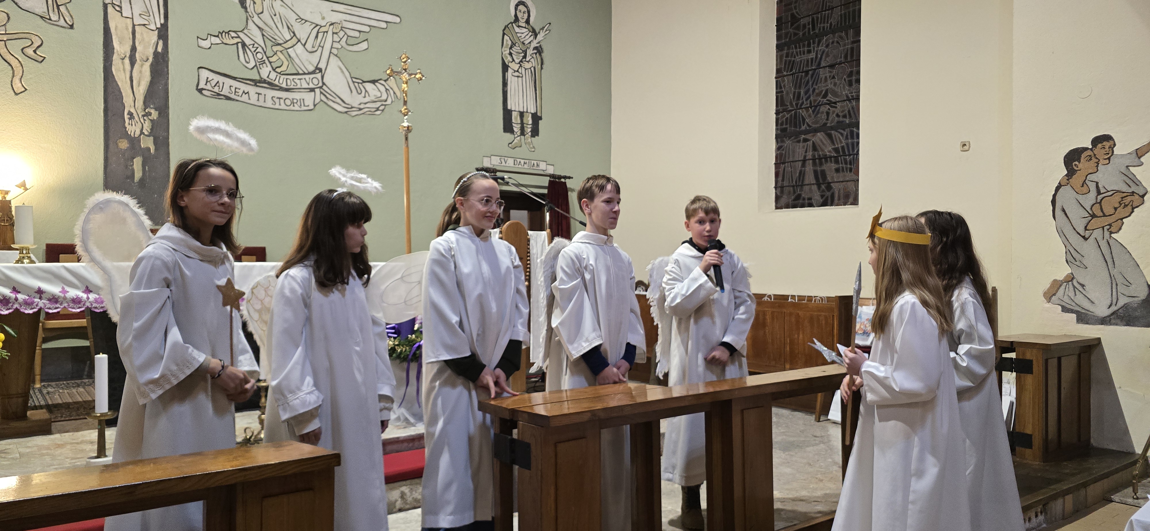 Današnje čakanje na svetega Miklavža je bilo malce mučno, minute so se vlekle...Medtem ko so veroučenci uprizorili igrico, so naši najmlajši vedno znova pogledovali nazaj proti vratom cerkve. A ko se ja pojavila brada svetega Miklavža, je vsem zadišalo po sladkih pričakovanjih in povečalo se veselje v cerkvi. Za piko na i je ob koncu večera v župnišču zadišalo po pici, kar je veroučence še posebej navdušilo.