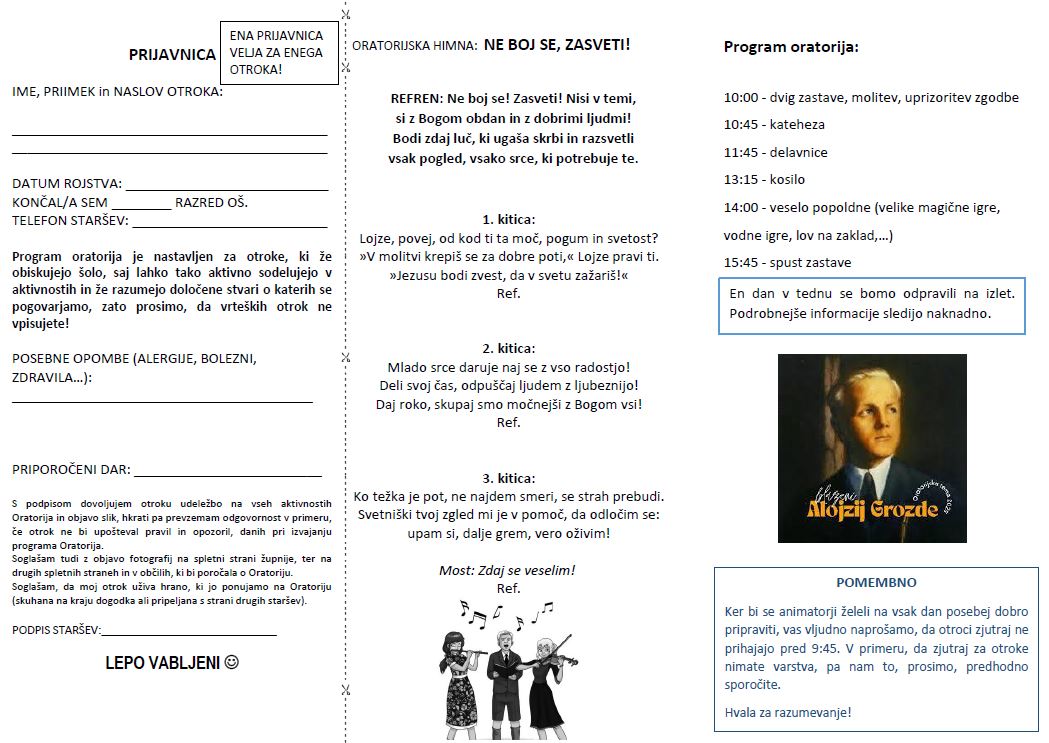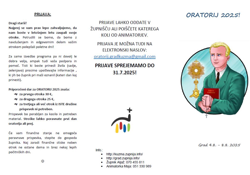 PRIJAVA JE MOŽNA TUDI NA ELEKTRONSKI NASLOV: oratorij.gradkuzma@gmail.com